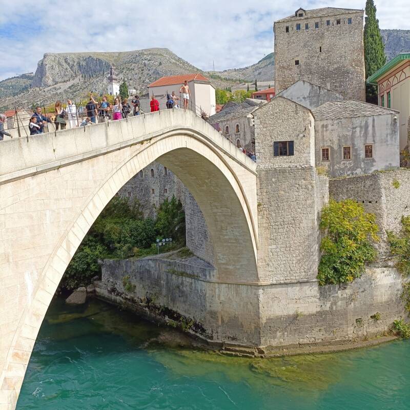 Terwijl we wachten tot andere toeristen over de brug komen bedenk ik me dat vijftig euro nog een sympathiek bedrag is. Als ik zelf zou springen moet ik rekening houden met de reparatiekosten voor diverse botbreuken, onderkoelingsverschijnselen en de oudrussische traumahelikopter die mij, gehuld in zwarte rookwolken en met minimaal één afgebroken wiek, twintig kilometer stroomafwaarts op zal moeten halen. Dit scenario zal puur hypothetisch blijven, want de Mostari hebben een scholingstraject ontwikkeld voor bronstige toeristen die een door alcohol en testosteron gedreven behoefte voelen om hun mannelijkheid te bewijzen. Naar eigen zeggen om ongelukken te voorkomen, maar het zal ook iets met hun eigen verdienmodel te maken hebben. Ik ga er in ieder geval niet aan beginnen, want ondanks het scholingstraject lijkt het me een gevaarlijke vrijetijdsbesteding.