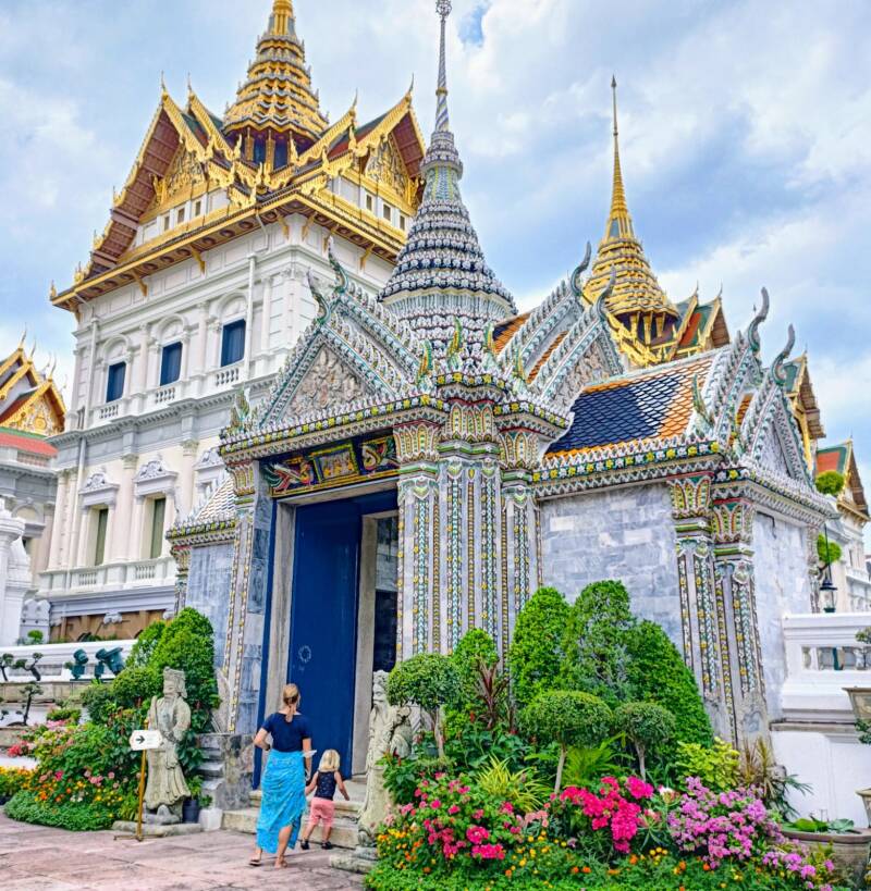 Om Jamie niet tot waanzin te drijven zoeken we de volgende dag betrekkelijke rust binnen de tempels die zijn uitgestrooid over het centrum van de stad. Het boeddhistische epicentrum van Thailand wordt gevormd door Wat Phra Kaew, waar zich de Smaragdgroene Boeddha bevindt, het belangrijkste religieuze beeld voor de Thai. Dit beeld is slechts zestig centimeter hoog, maar waar het door omgeven wordt tart de verbeelding in al haar grootsheid. We zijn wat betreft godsdienstige overdaad toch redelijk door de wol geverfd, maar we hebben uren verbijsterd rondgelopen door het onwerkelijke bombast waarmee de doorgaans bescheiden boeddhisten zich hier presenteren. Gedetailleerde muurschilderingen voorzien van bladgoud, tientallen meters hoge torens van gestapeld keramiek, gelaagde daken met gouden ornamenten en prieëlen vol hangende bloemen en gemanicuurde bonsai. Het is als een sprookjeswereld die tot stand is gekomen na een succesvolle samenwerking tussen Michelangelo, Walt Disney en de hoofddecorateur van Intratuin. Het kwistige gebruik van dieren en fantasiewezens binnen het complex sprak ook Jamie erg tot de verbeelding, waardoor hij op zoek kon naar olifanten met benen, draken met vijf hoofden en zelfs clowns. Die laatste zijn eigenlijk ‘demonische bewaarders’, maar goed, deze hele onderneming is tot op heden een behoorlijk hallucinante ervaring, dus dat kon er ook nog wel bij.