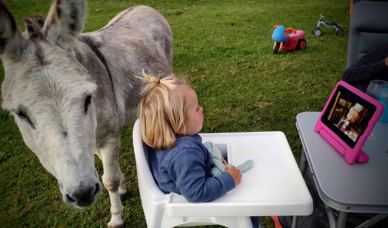 Ik kom terug met een stapel takken, een aantal koeien en een ezel loopt langs. De ezel komt achter Jamie staan en kijkt over zijn schouder mee naar het filmpje. Jamie draait zich om. ‘Hé ezel’ zegt hij, en kijkt weer verder. Vandaag wordt hij 2. Mocht je hem willen feliciteren: hij is thuis, in Roemenië.