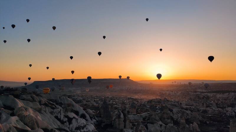 De vallei vult zich met steeds meer vlammen. Kleine vuurtjes lijken het, met de rode gloed van de ballon erboven. Tegen de zwartblauwe lucht zweven de eersten al naar boven. Jamie eet een koekje, hij trilt van de kou. Het is half zes ‘s ochtends, we zoeken de ballon van mama. Hele trossen komen nu omhoog terwijl de horizon rood kleurt, in stilte zwevend boven de onwerkelijke rotsformaties van Cappadocië. Als de zon boven de bergen uitkomt worden de kleuren zichtbaar, als een schilderij dat door een onzichtbare hand wordt ingekleurd. Honderden ballonnen in alle kleuren van de regenboog sieren de lucht om ons heen, als een onwerkelijke droom waar je niet uit wilt ontwaken. De wereld viert een feestje en hangt de versiering alvast op, en hoe leuk - we zijn uitgenodigd! Lin in de lucht, ik in de zevende hemel, en Jamie - die krijgt nog een koekje om de teleurstelling te verwerken, want mama zien we niet.